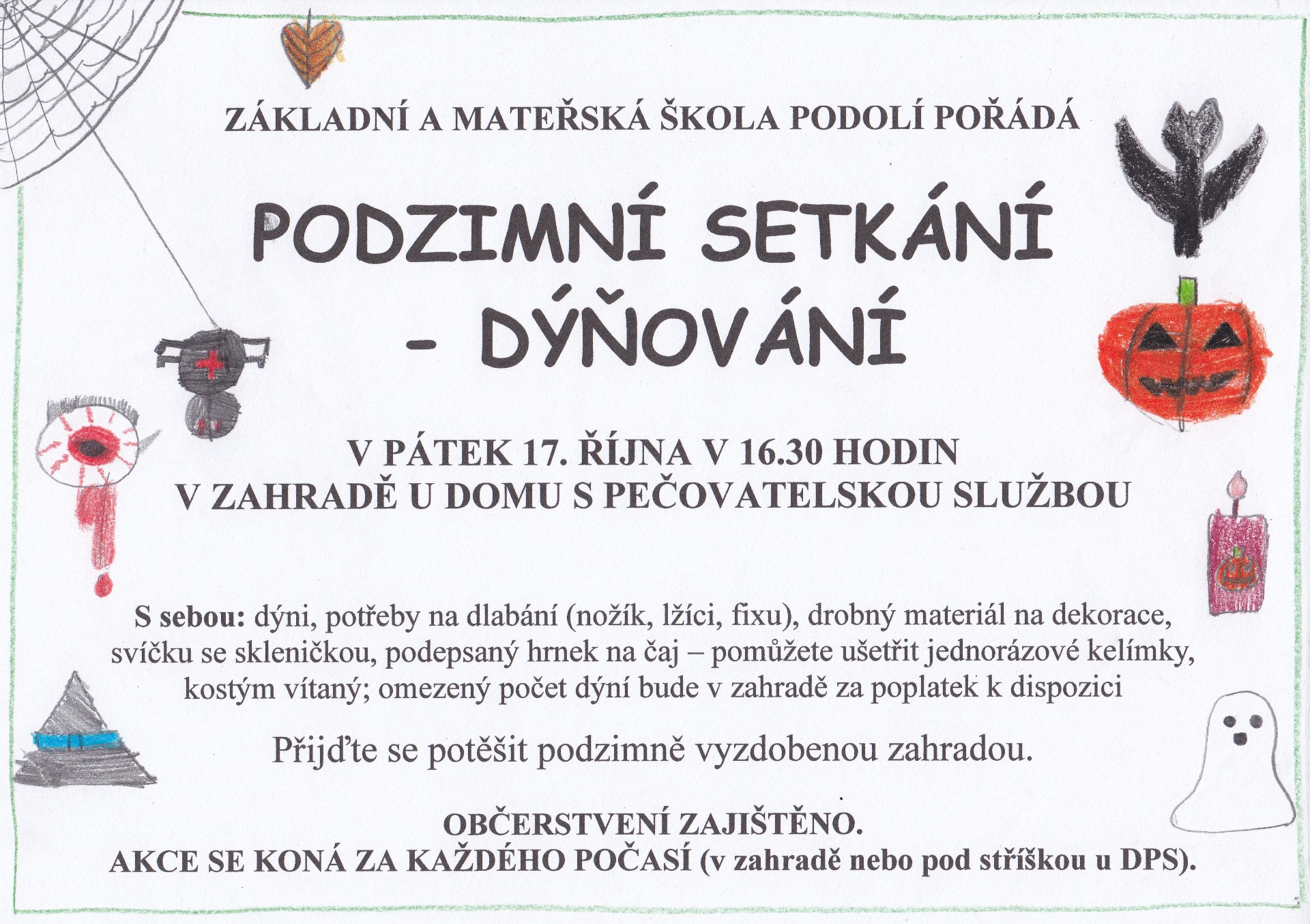 V pátek 17. 10. od 16:30 se v zahradě u DPS koná tradiční podzimní dýňování. Všichni jsou srdečně zváni, sejdeme se za každého počasí.