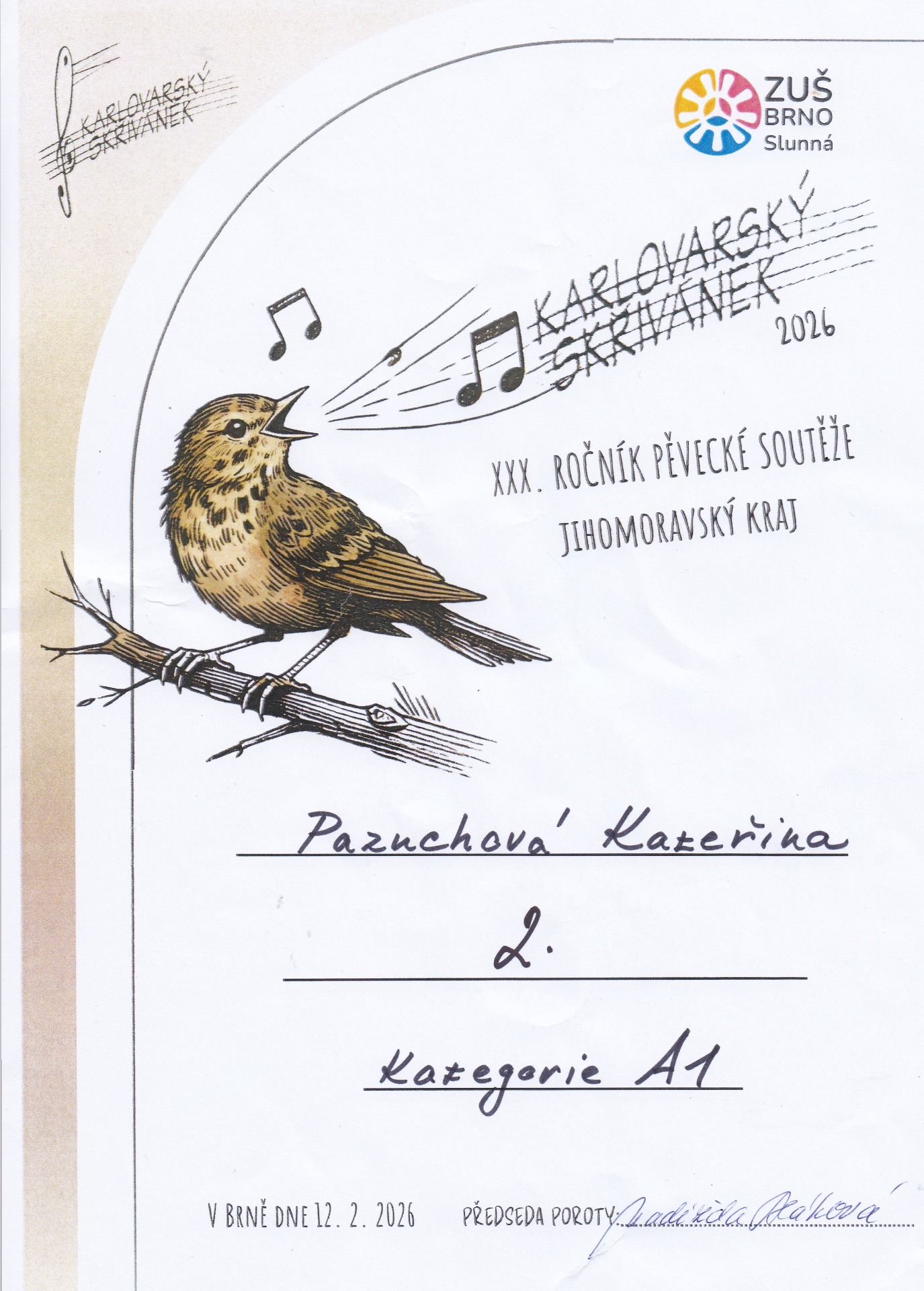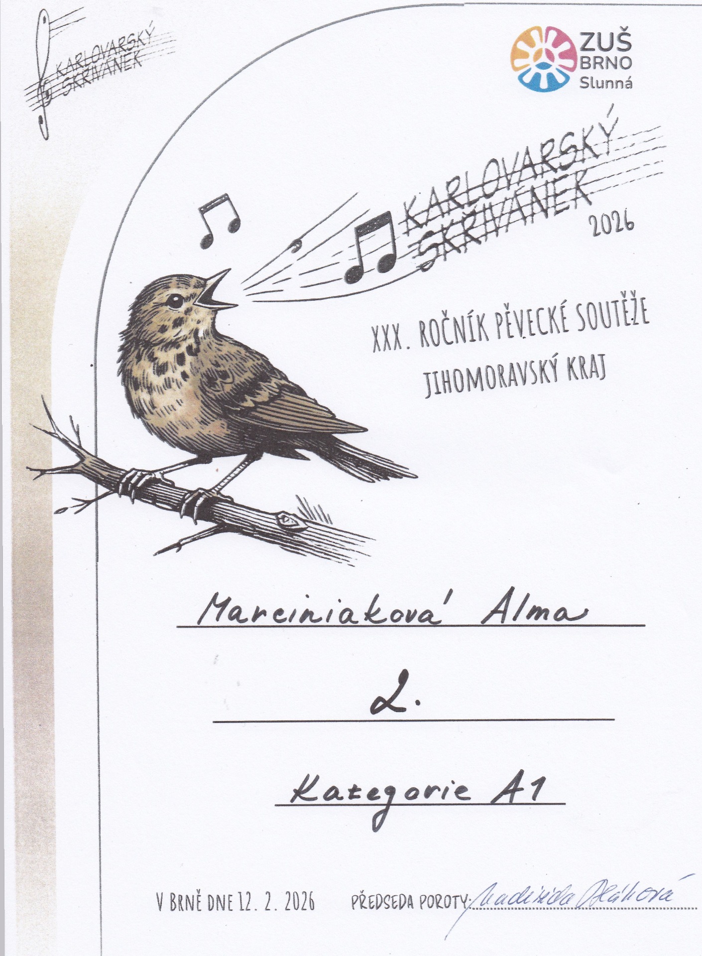 Ve čtvrtek 12. února proběhlo krajské kolo celostátní pěvecké soutěže Karlovarský skřivánek. Naši školu reprezentovali tři žáci. Kateřina Pazuchová a Alma Marciniaková obsadily ve své kategorii shodně 2. místo. Ondřej Kvoch se ve své kategorii umístil na 1. místě a opět postoupil do celostátního kola v Karlových Varech. Všem zúčastněným gratulujeme, děkujeme za krásnou reprezentaci školy a Ondrovi budeme držet palce v dalším kole.