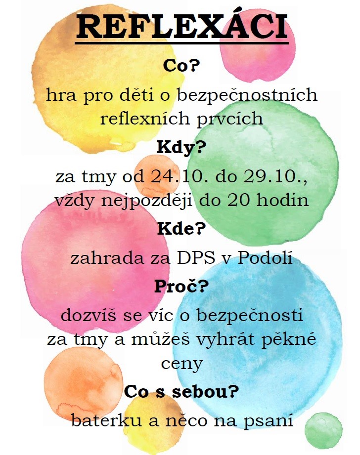 Opět po roce budou mít děti možnost zúčastnit se "noční" hry s reflexními prvky. Od pátku 24. 10. do středy 29. 10. budou v zahradě za DPS pověšeny soutěžní otázky o reflexních prvcích. Doporučujeme přijít za tmy a s baterkou, abyste si mohli přímo vyzkoušet, jak reflexky fungují.