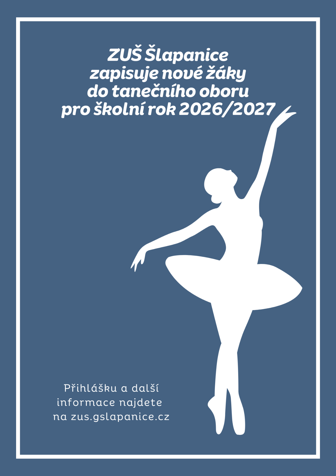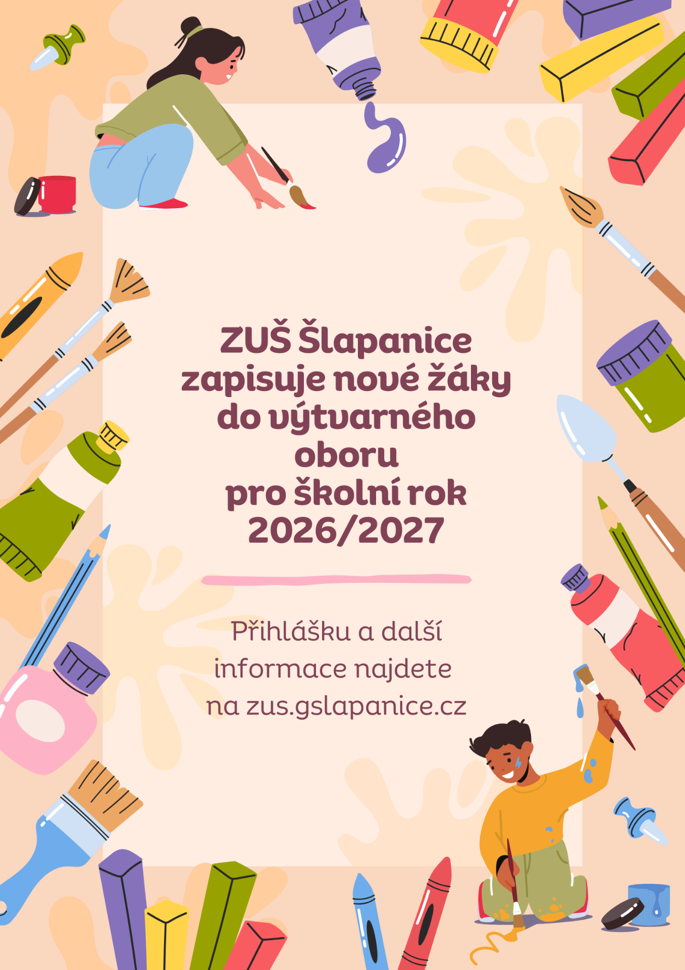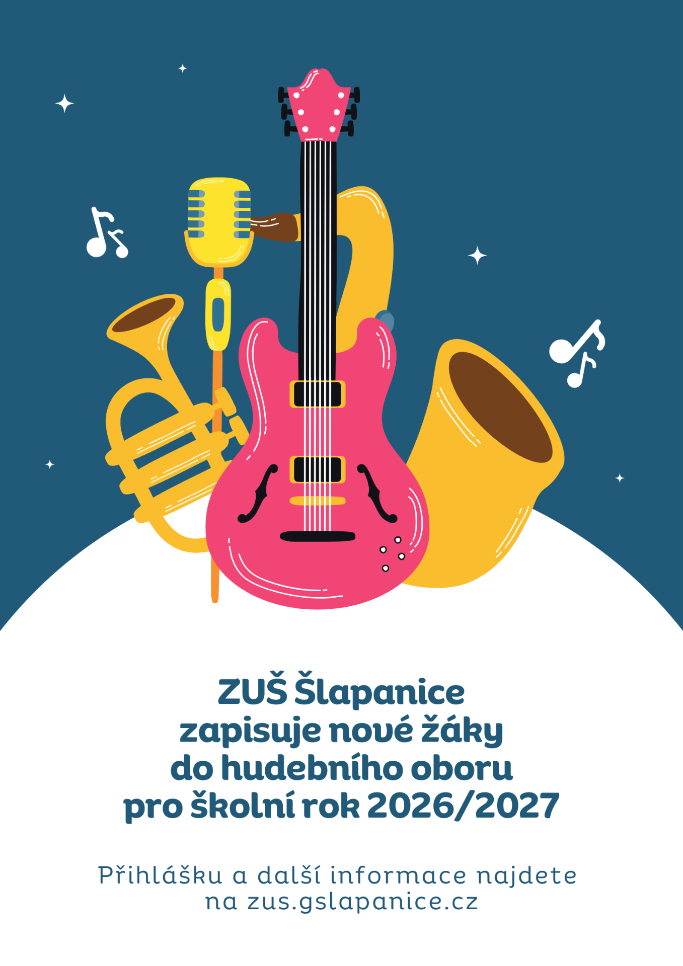 ZUŠ Šlapanice zapisuje nové žáky na školní rok 2026/27 na výtvarný obor, hudební obor a taneční obor. Výuka hry na hudební nástroj je v případě zájmu možná i přímo v ZŠ Podolí. Přihlášky a další informace najdete na stránkách ZUŠ Šlapanice.